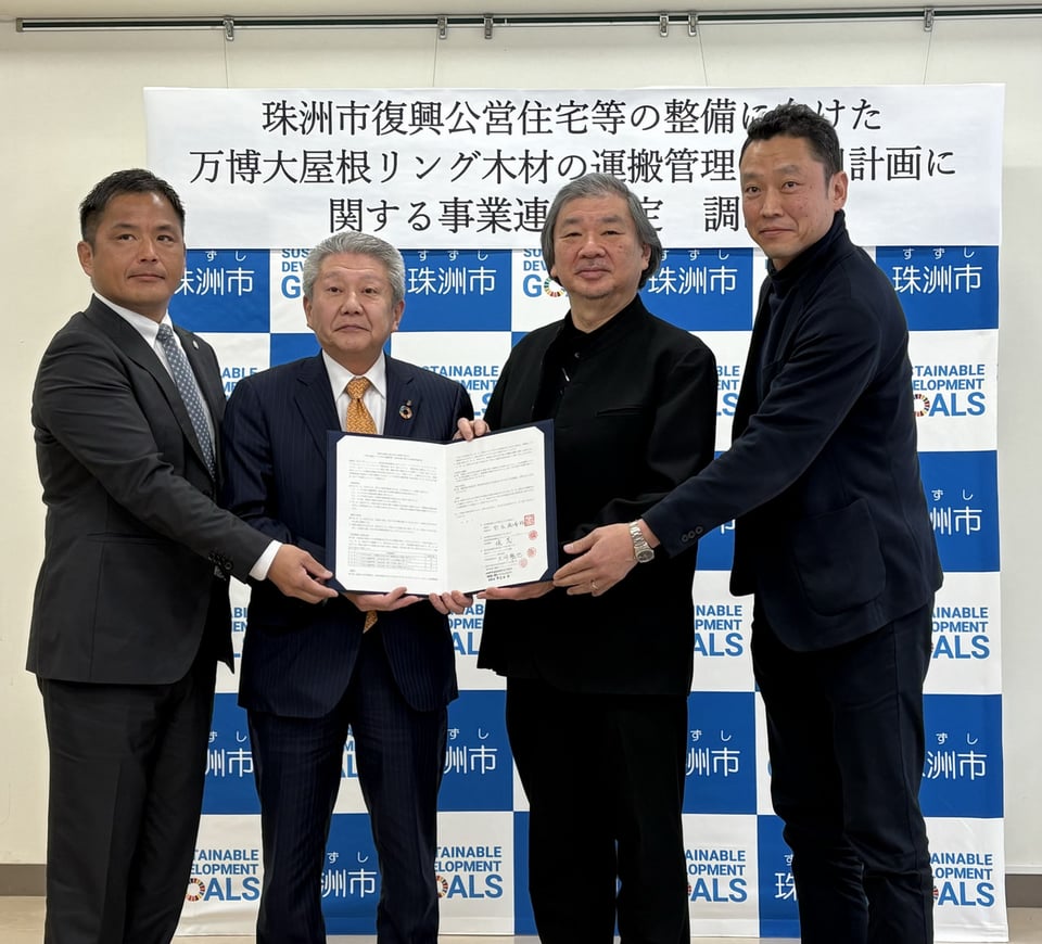 一般社団法人関西イノベーションセンター(以下 MUIC Kansai)は、珠洲市、特定非営利活動法人ボランタリー・アーキテクツ・ネットワーク、ファーストウッド株式会社と共に、2025大阪・関西万博に建設された大屋根リングの木材を、珠洲市復興公営住宅等に活用する為、リング木材の運搬管理・活用計画について、事業連携協定を締結しました。